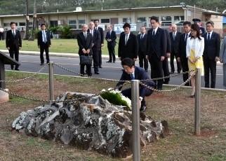 安倍為飯?zhí)锓刻凹o(jì)念碑”獻(xiàn)花。圖片來自日本外務(wù)省網(wǎng)站