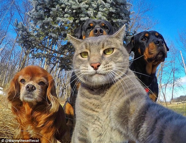 一只愛自拍的貓,和它的三只狗伙伴。