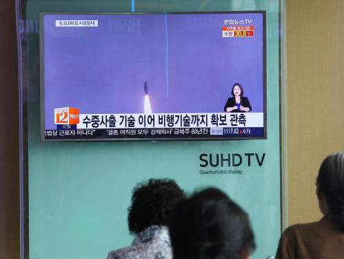 2016年8月24日,韓國軍方稱朝鮮發射一枚潛射導彈。圖為當日在韓國首爾火車站,旅客通過大屏幕觀看相關報道。新華社發