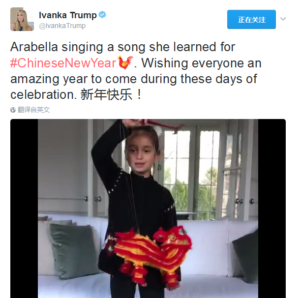 2日一大早,伊萬卡發(fā)了這樣一條推文:“阿拉貝拉唱著她從中國新年學(xué)到的歌曲,在這節(jié)日慶典之際,祝愿每個人都有個精彩的新年。新年快樂!”其中最后“新年快樂”4字是用中文所寫,并配發(fā)了女兒用普通話演唱中國歌曲《新年好》的視頻。