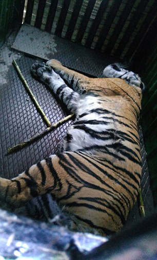 當(dāng)?shù)卮迕耖_著拖拉機(jī)壓平農(nóng)作物,為搜尋老虎開辟道路。護(hù)林員騎著大象展開搜尋工作。人們發(fā)現(xiàn)老虎時它正在撕咬一名男子,男子失去了一只胳膊和一條腿,并且已經(jīng)死亡。老虎試圖攻擊村民并逃跑,搜尋人員發(fā)射了幾十枚鎮(zhèn)定飛鏢后,老虎才失去意識并倒下。
