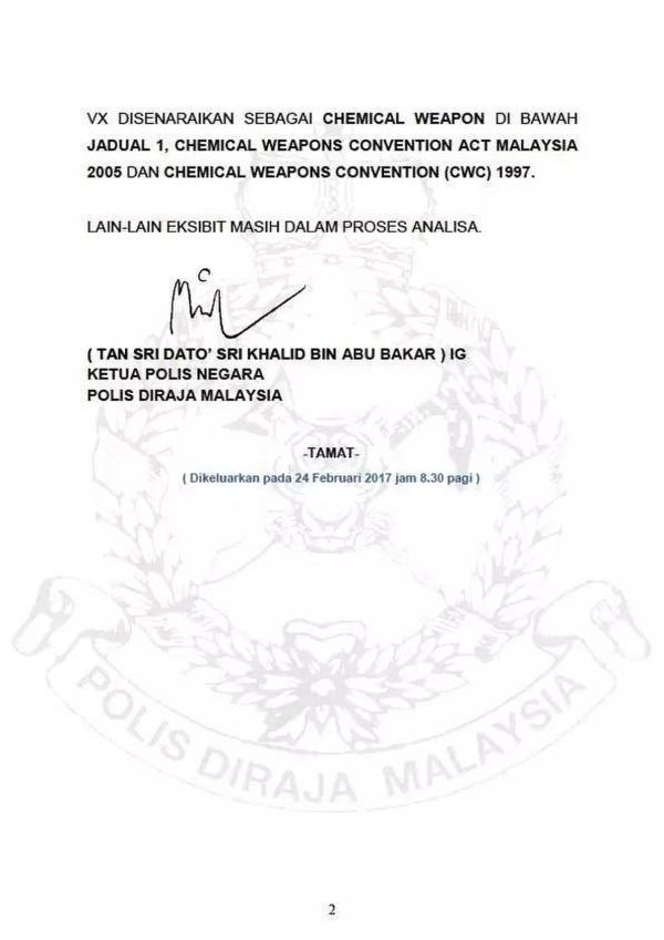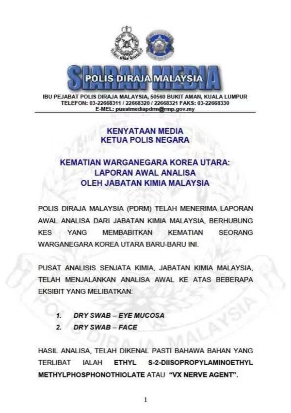 今天上午,馬來(lái)西亞警方發(fā)表聲明稱,警方已收到初步的尸檢報(bào)告,通過(guò)對(duì)死者眼粘膜和臉部樣本分析,檢測(cè)出了一種叫VX的神經(jīng)毒劑成分。