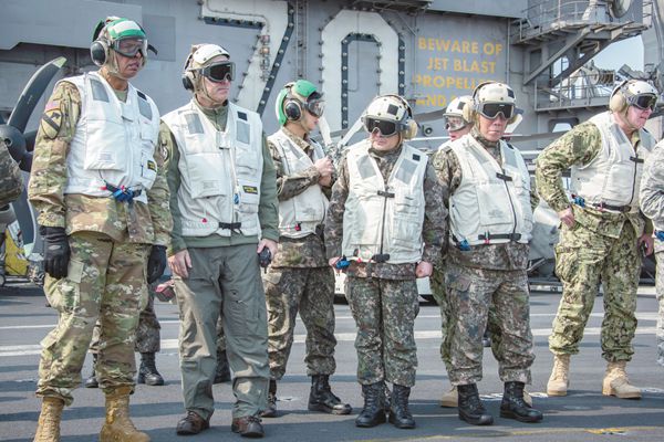韓聯(lián)合參謀本部議長(zhǎng)李淳鎮(zhèn)(左四)和美韓聯(lián)合司令部司令布魯克斯(左一)登上“卡爾·文森”號(hào)航母。