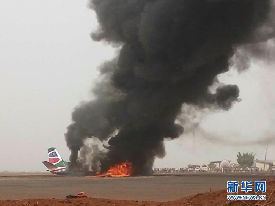 3月20日,在南蘇丹瓦烏機場,墜毀的客機冒出濃煙。一架小型客機20日下午在南蘇丹瓦烏機場著陸時墜毀,燃起大火并伴有爆炸,目前傷亡情況不明。 新華社發(劉俊豪 攝)