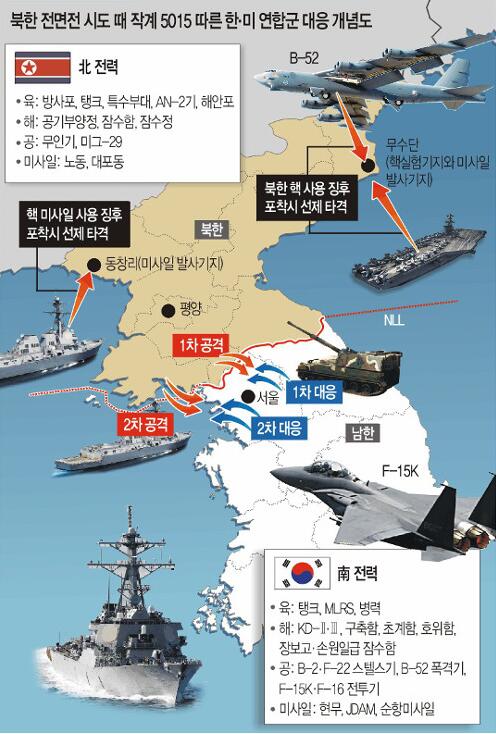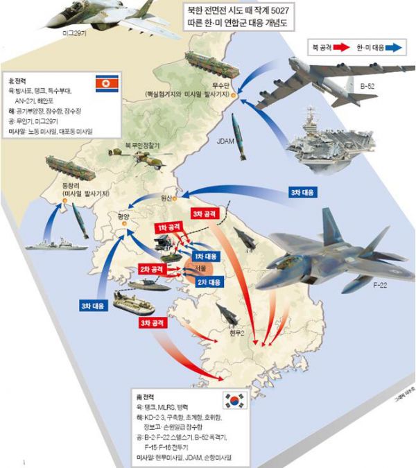 《5027計劃》的設想則是大規模全面戰爭,其設想在朝韓爆發沖突后,以五個階段的作戰實現目標: