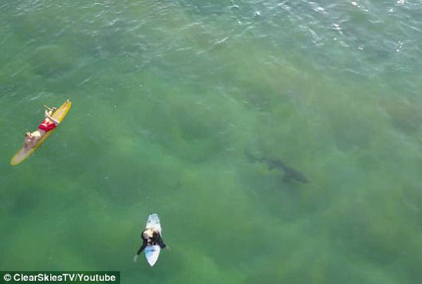 大衛拍下了這驚險的一幕,并將視頻傳到了YouTube上。在視頻中,他發現鯊魚后和一旁的伙伴說道:“天哪!那里有一頭鯊魚。它就在那幾名沖浪者下面。”接著,他操控無人機漸漸下降,試圖提醒沖浪者們鯊魚就在旁邊。與此同時,鯊魚似乎受到了驚嚇,自行游走了。