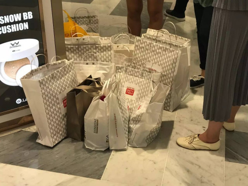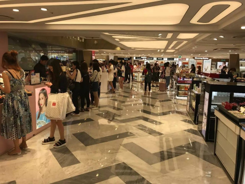 名牌高檔箱包店面基本無人問津,在更受中國游客歡迎的化妝品柜臺有一定數量的游客。一些較受歡迎化妝品柜臺的地上擺放著一些包裹好的商品,據稱是當天顧客購買后存下寄送的。