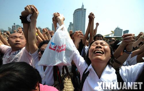 5月19日,北京天安門廣場的群眾在默哀后齊聲高呼“中國加油!”“汶川加油!”。 2008年5月19日至21日為全國哀悼日。5月19日14時28分起,全國人民默哀3分鐘,汽車、火車、輪船鳴笛,防空警報鳴響。 新華社記者薛東梅攝