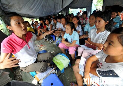 6月9日, 來自陜西安康水電廠的志愿者杜文娟(左一)在帳篷里為孩子們講述她來到四川地震災區當志愿者20多天的服務經歷,鼓勵學生好好學習,重建自己的美好家園。 當日,志愿者教師在四川省江油市災區的帳篷學校里和這里的近百名學生上完帳篷里的最后一課。 隨著四川地震災區生產生活的逐步恢復,失散的學生也陸續回到學校復課,災區教學工作一天天走向正軌,一些帳篷臨時學校也由此結束其特殊使命。江油市帳篷臨時學校從5月19日開辦以來,前后共有60多個自愿者來到這里為孩子上課服務,最多時這里的學生達400多名。 新華社記者 張國俊 攝