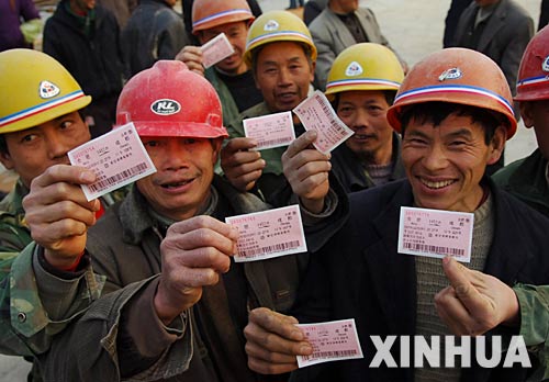 2007年1月30日,幾位來自四川樂山的農(nóng)民工展示剛買到的火車票。當(dāng)日,合肥火車站派專人將火車票送到合肥至潛山高速公路岳西段工地,為長年在深山里務(wù)工的農(nóng)民工回家過年提供便利。(新華社記者李健攝)