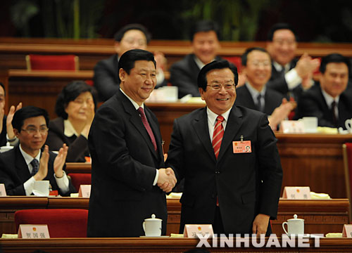 3月15日,十一屆全國人大一次會議在北京人民大會堂舉行第五次全體會議,選舉第十一屆全國人民代表大會常務委員會委員長、副委員長、秘書長;選舉第十一屆全國人民代表大會常務委員會委員;選舉中華人民共和國主席、副主席;選舉中華人民共和國中央軍事委員會主席。這是習近平當選中華人民共和國副主席后,曾慶紅與習近平握手。 新華社記者李學仁攝