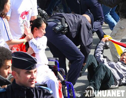 4月7日,北京奧運圣火在巴黎傳遞時遭遇少數“藏獨”分子的干擾破壞。這是巴黎警察及時制止一名擾亂火炬傳遞者試圖從火炬手手中搶奪火炬。 新華社記者戚恒攝