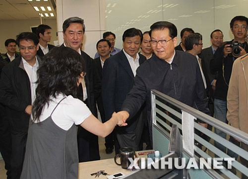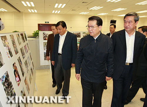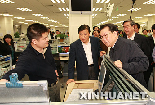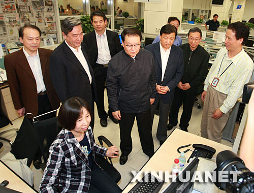 這是李長春在新華社新聞信息發(fā)稿中心觀看新華社播發(fā)的抗震救災(zāi)新聞圖片。 新華社記者 龐興雷 攝