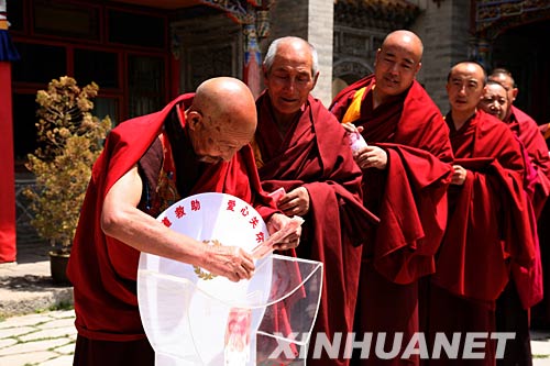 資料圖片:5月14日,塔爾寺僧眾在為災區捐款。當日,青海省著名佛教圣地塔爾寺近千名僧侶通過青海省紅十字會向四川地震災區捐款10萬元。 新華社記者 楊壽德 攝