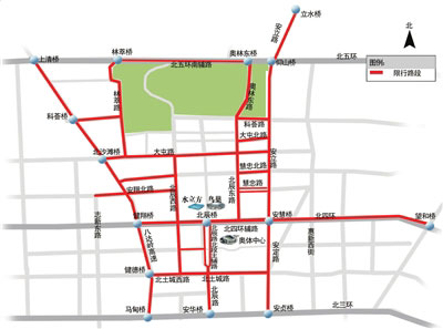 限行路段:建國門橋向北經(jīng)東二環(huán)路、北二環(huán)路主路(不含輔路)至鐘樓北橋(單向);復(fù)興門橋向北經(jīng)西二環(huán)路、北二環(huán)路主路(不含輔路)至鐘樓北橋(單向),除奧運(yùn)專用車輛、公共汽車和持有閉幕式車證的車輛外,禁止其他車輛通行。