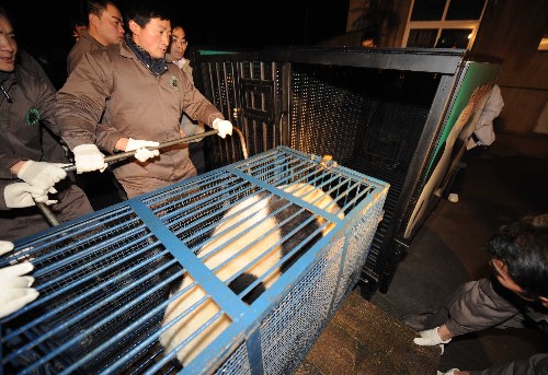 12月23日,工作人員將大熊貓裝籠上車。 新華社記者 陳燮 攝