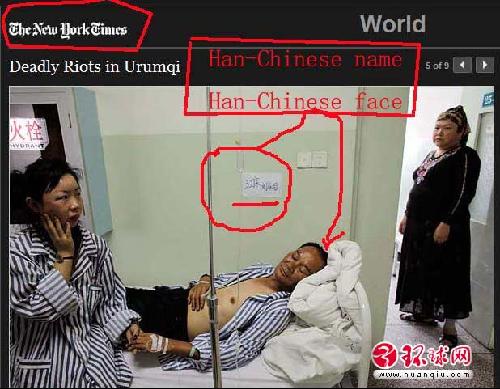 7月6日,美國《紐約時報》在報道此次事件時配發了大量圖片,其中一張圖片說明稱:“受傷的維吾爾族人躺在醫院中”。然而,照片中可以清晰地看到,病床墻上的床號上標明“32,劉永合”。