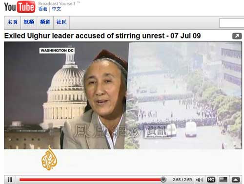 圖注:熱比婭接受半島電視臺專訪,手持國內石首事件的圖片,謊稱是這是烏魯木齊軍隊在鎮壓維族民眾