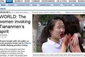 7月8日,英國網站monstersandcritics刊登了24張烏魯木齊騷亂的照片,在這些照片中,13張是全副武裝的中國士兵;5張是抗議和哭泣的少數民族,其中多張是婦女和兒童;漢人帶著防身器具上街游行的有4張;維族人看被推翻的汽車以及走過被漢人破壞的餐館各一張。整組圖片有意要透出什么信息不言而喻。