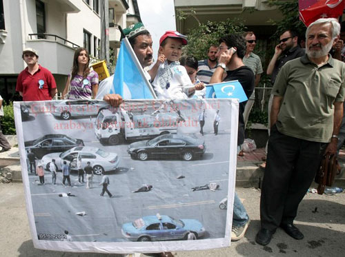 法新社7月8日發布一張圖片,圖片說明為“2009年7月7日,中國駐土耳其(安卡拉)大使館前發生示威,期間一位抱著孩子的示威者拿著美國維吾爾協會發布的一張圖片,圖片明顯展示出新疆暴亂的暴力受害者!