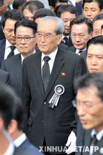 8月21日,在韓國首都首爾設在國會的已故前總統金大中的正式靈堂,由朝鮮勞動黨中央書記金己男率領的朝鮮吊唁團吊唁韓國前總統金大中。新華社/法新