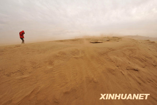 12月24日,寧夏銀川市興慶區(qū)月牙湖鄉(xiāng),一名記者在風(fēng)沙中拍照。新華社記者 王鵬 攝