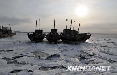 1月14日至18日,記者隨國家海洋局預報減災司司長林山青帶隊的海冰調查組在渤海沿岸看到,一片片的商船和漁船被冰封在海上,如赤壁聯營,蔚為壯觀。