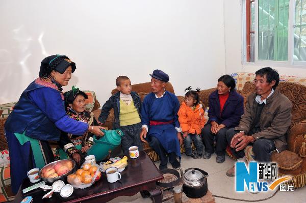 2008年5月12日四川汶川大地震突然襲來,在家忙著收拾家務的理縣甘堡鄉日爾腳村村民王富貴,頓感天眩地轉、站立不穩,本能地跳出房屋,循著救命的呼喊將鄰居楊志蘭家祖孫三口救出。他不顧自己的傷情,馬上挨家搜救,又救出了三郎班卓等村民。 5月8日,臨近地震兩周年紀念日,王富貴在自己的新家迎來了當年被自己搭救的楊志蘭和她的孫兒、孫女、三郎班卓和她的丈夫王海清,談起這段往事,楊志蘭和三朗班卓泣不成聲,說:忘不了,忘不了,忘不了你的救命之恩!這是王富貴(左一)和被救的三郎班卓(右一)及楊志蘭祖孫三人(5月8日攝)。 新華社記者 何俊昌 攝
