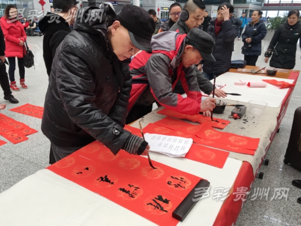 相比平時,春運期間的貴陽北站顯得更加溫情。在北站候車廳內(nèi),7位來自貴陽鐵路老年書畫協(xié)會的書畫家們揮毫潑墨,寫下一幅幅精美的對聯(lián)送給過往的旅客們,讓回家的路既平安又暖心。