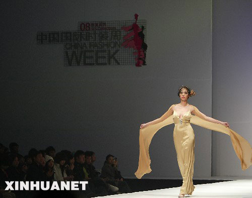 11月7日,模特在展示潘黛麗時(shí)裝作品。 當(dāng)日,中國(guó)國(guó)際時(shí)裝周2008春夏系列發(fā)布之臺(tái)灣設(shè)計(jì)師潘黛麗時(shí)裝發(fā)布會(huì)在北京飯店舉行。新華社記者 尹棟遜 攝