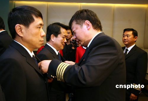 12月10日,四川航空集團公司繼兩年前在大陸首家引進8名臺籍飛行員后,再次引進12名臺籍飛行員。圖為川航負責人在第二批臺灣飛行員開飛儀式上,為他們佩戴飛行胸章和領帶。 中新社發 蔡超 攝