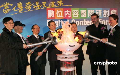 一月二十四日,由臺北市電腦公會主辦的“二00八臺北國際電玩展”在臺北世貿一館開幕。展覽以“全家都是玩家”為主題,推出數字游戲、家用游戲機、游戲學校、玩具模型、動漫畫等多種電玩產品。圖為主辦方在同期舉行的以“當傳奇遇見未來”為主軸的“二00八數位內容國際研討會”上,點燃象征臺灣數位內容產業的圣火臺。 中新社發 孫自法 攝