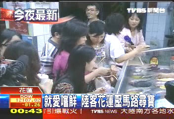 中新網(wǎng)6月18日電 據(jù)臺(tái)灣TVBS報(bào)道,大陸赴臺(tái)游踩線考察團(tuán)昨天晚上抵達(dá)花蓮,不顧先前勞頓,依舊精力旺盛,吃東西、買東西,對(duì)花蓮的名產(chǎn)樣樣覺得很新鮮。花蓮業(yè)者半買半送,希望口碑能借由考察團(tuán)帶回大陸。