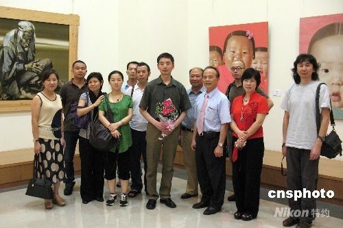 由中央美術(shù)學(xué)院協(xié)辦的“同道——中央美術(shù)學(xué)院教授聯(lián)展”七月十九日下午在臺北桃園長流美術(shù)館舉行酒會(huì),慶祝展覽。參展畫家包括靳尚誼、王沂東、高天雄、袁元、曹吉?jiǎng)偂⒂嚓、葉南、王少倫、賀羽、康蕾、陸亮、孫韜、孫遜共十三位,展出作品約一百一十件,代表了大陸當(dāng)代油畫的多元特色。圖為在長流美術(shù)館的展室內(nèi)的部分參展畫家。 中新社發(fā) 徐長安 攝