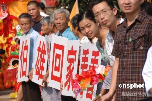 八月十四日上午,中國國民黨主席吳伯雄一行在時隔八年后再次回到福建永定縣下洋鎮思賢村謁祖。圖為鄉親打出“伯雄常回家看看”的橫幅。 中新社發 鄭祚聲 攝