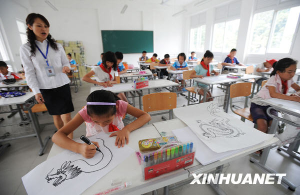 9月1日,都江堰頂新新建小學的學生正在上新學期的第一堂美術課。 新華社記者 江宏景攝