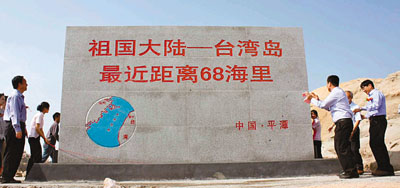 大陸距臺最近地點福建平潭島30日設(shè)立石碑,與臺灣新竹已有的石碑遙相呼應(yīng),共同標(biāo)注兩岸最近距離,臺灣新竹市長林政則更是親自為石碑揭幕。平潭島距臺灣新竹南寮漁港近僅68海里,約為126公里。記者看到,此次在平潭設(shè)立的石碑高3米、寬5米,上書“祖國大陸─臺灣島最近距離68海里”,并雕刻了海峽兩岸位置圖。(圖片來源:新華網(wǎng))