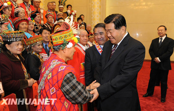 12月21日,中共中央政治局常委、全國政協主席賈慶林在北京人民大會堂會見臺灣少數民族代表人士訪問團一行。