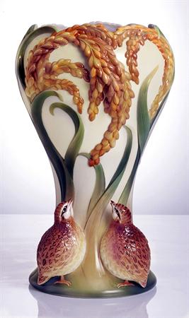 海基會(huì)表示,“安和升祥”紀(jì)念瓶,浮雕了兩只拙樸可愛的鵪鶉,仰望著上方結(jié)實(shí)、飽滿的兩串稻米。鵪鶉是古代繪畫常見的吉祥鳥獸;稻米結(jié)實(shí)累累,象征豐足的太平盛世。鵪鶉與稻禾相伴,取其諧音“安和”之意,代表對兩岸安定、和平的期盼。海協(xié)會(huì)贈(zèng)給海基會(huì)的紀(jì)念品是揚(yáng)州漆器畫作,名為“和平發(fā)展”。它以寶石及揚(yáng)州漆器雕砌出一幅牡丹圖,陳云林說是“和平花”。