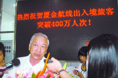 2009年7月10日,陳信仲作為廈金航線(xiàn)第400萬(wàn)名旅客正在接受媒體采訪(fǎng)。 葉明亮 鄭曉強(qiáng) 攝 (資料圖片)