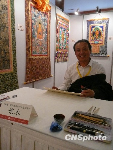 內容豐富多彩的大美青海臺灣行活動16日拉開帷幕。作為推動兩岸交流的一次重要活動,青海副省長王令浚16日在臺北圓山飯店主持一場推介會,期盼有更多的臺商到青海投資,更多的臺灣旅客到青海旅游觀光。圖為青海著名唐卡藝術家在現場為來賓繪畫。 中新社發 閆曉虹 攝