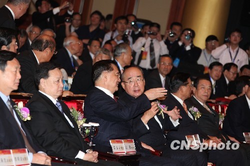 4月20日上午,2010臺灣·湖北(武漢)周在臺北圓山大飯店開幕。中國國民黨榮譽主席連戰(前排左三)、吳伯雄(左四),臺灣;鶗麻L江丙坤、臺灣工業總會理事長陳武雄等人出席并致辭,左二為首度訪臺的中共湖北省委書記羅清泉。 中新社發 董會峰 攝