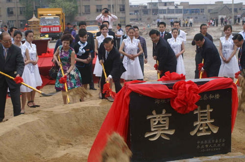 5月4日下午,海峽兩岸交流基地標志性建筑泰和樓在山東省棗莊市臺兒莊古城隆重奠基。中國國民黨榮譽主席連戰出席了奠基儀式。