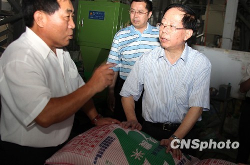 5月24日,海峽兩岸農業交流協會名譽會長危朝安結束為期6天的臺灣“鄉村之旅”,搭機自高雄小港機場離臺,他向中新社記者表示,此次走訪臺灣北、中、南,探農情、詢合作、盼多贏,收獲良多。圖為危朝安(右)探訪高雄縣美濃鎮一家“美農米”碾米廠。 中新社發 董會峰 攝