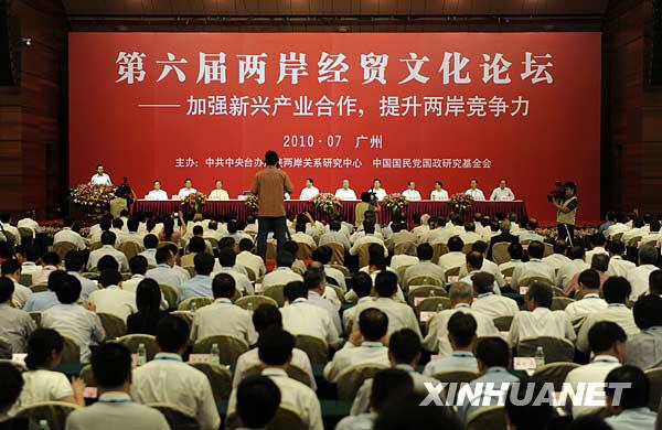 第六屆兩岸經貿文化論壇10日在廣州開幕。中共中央政治局常委、全國政協主席賈慶林和中國國民黨榮譽主席吳伯雄等兩黨高層人士和兩岸工業、科技、能源、環保產業界以及文化、教育、體育、新聞界代表400余人出席。