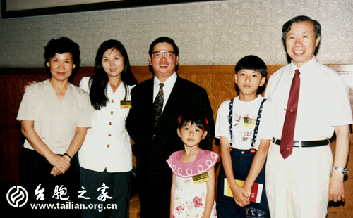 1994年隨第二屆臺灣小天使到大陸交流時,翁林澄一家與為時任全國臺聯宣傳部長的焦萬曼(左一、勾德元(右一)在一起。右二為翁林宇。全國臺聯文宣部/提供