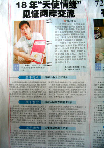 如果說他此行還有什么遺憾,那就是他沒能見到當年參加第三屆和平小天使活動時在西安結識的小伙伴江洲洋。為了使訪談節目更加生動好看,我曾建議兩岸參加活動的“大天使”都帶上能勾起記憶的紀念物品,比如照片、錄像、小禮物、往來的書信等,也曾努力在兩岸“大天使”中找到他們當年的結對小伙伴。但是受種種因素制約,完成后一項難度非常大。