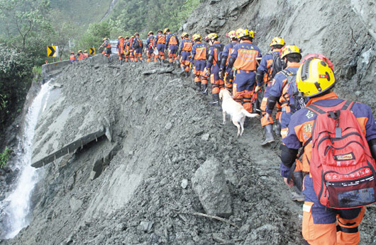 大批臺灣搜救人員帶著器材和搜救犬,搶進處處塌方的蘇花公路,搜尋在風災中失聯的26人。 來源:臺灣《聯合報》