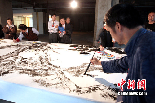 兩岸畫家18日繪制的畫作為百米長卷的其中一部分。20日上午,這幅8米長的畫作將與其余已完成的部分連成百米長卷向重慶市民進(jìn)行展示。屆時,約20名兩岸畫家將在現(xiàn)場完成最后的點睛之筆。