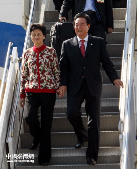 中國臺灣網(wǎng)12月20日臺北消息 20日中午,臺北桃園機(jī)場,海協(xié)會會長陳云林與夫人賴曉華攜手走下飛機(jī)。由陳云林率領(lǐng)的海協(xié)會協(xié)商代表團(tuán)乘坐國航CA185次航班,于當(dāng)天中午順利抵達(dá)臺北桃園機(jī)場,將參加于21日上午舉行的兩會領(lǐng)導(dǎo)人第六次會談。 (中國臺灣網(wǎng) 鐘寶華 攝)